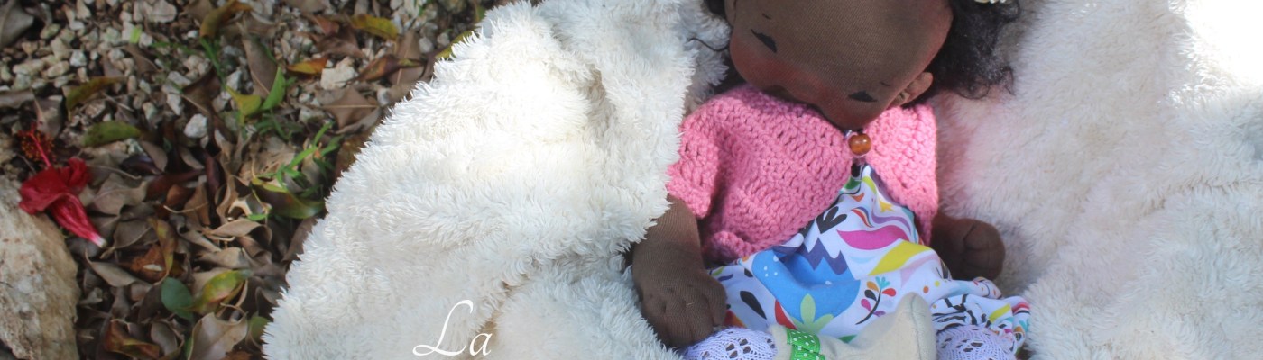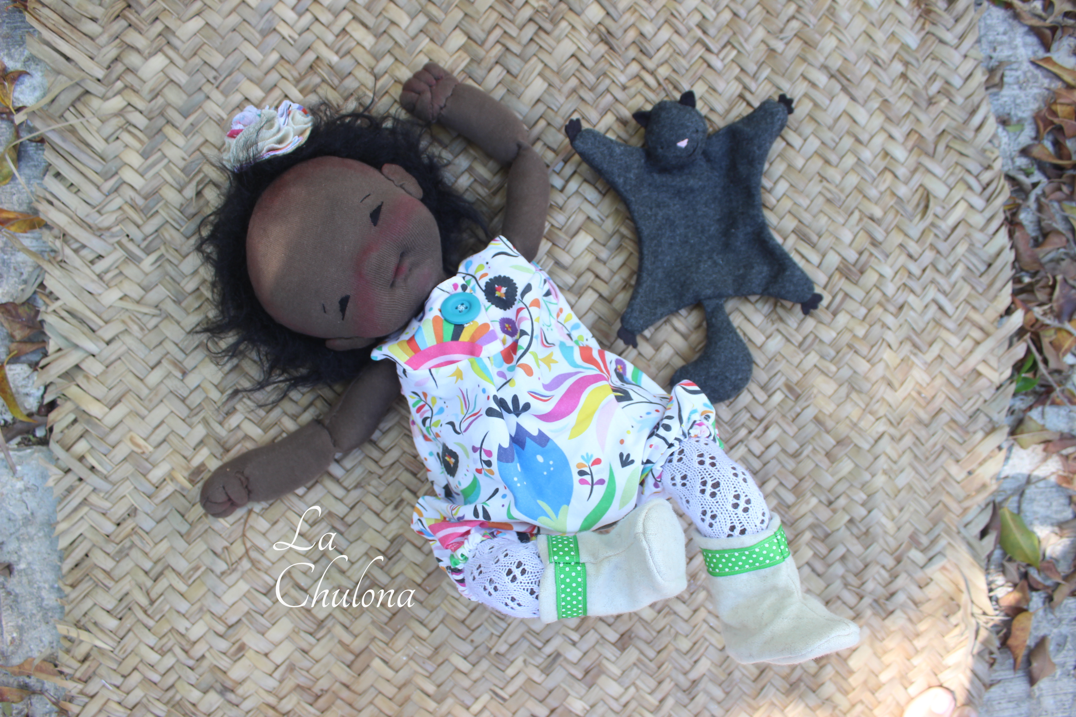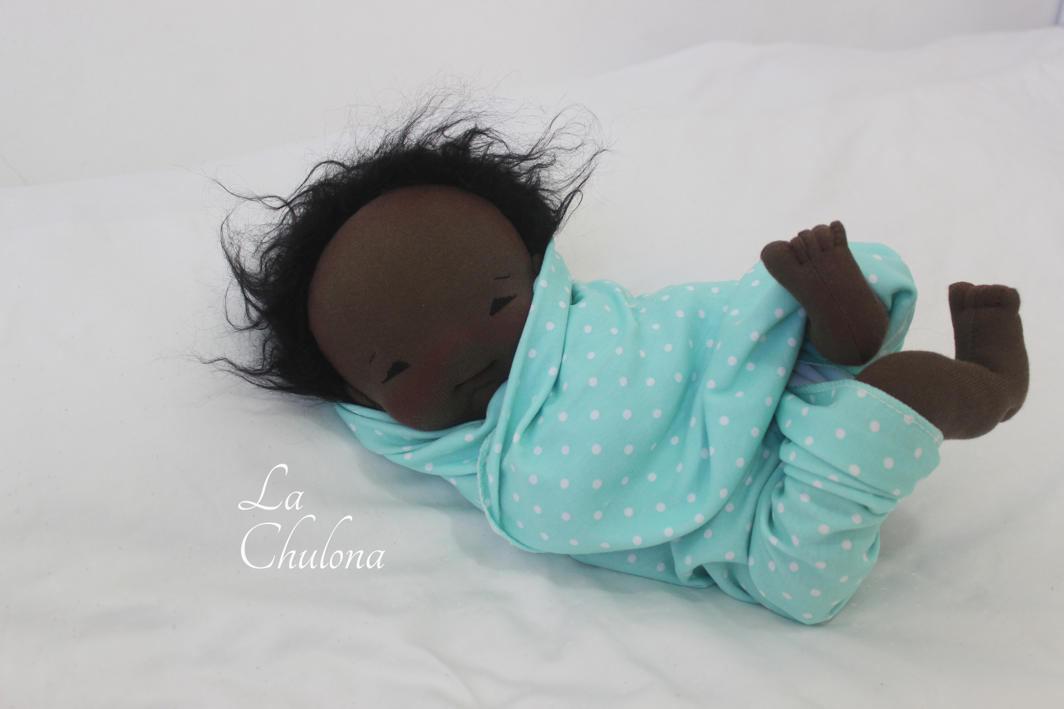 Micah is an 18 inch small newborn size natural fibers baby doll. She fits into newborn or bigger preemie clothes. Her skin is Laib Yala swiss tricot in dark brown color, her limbs are firmly filled with clean wool. Her torso is lined with interlock cotton fabric and filled with clean wool and clean craft sand for weight. Her head is very floppy and needs to be supported at all times, just like a real newborn baby.  Her legs are jointed with plastic safety joints for better posing. Her face is firmly needle felted, soft sculpted, and hand embroidered with cotton embroidery floss. Micah’s hair is black brushable mohair yarn crocheted into a wig and sewn to her head. It can be styled with fingers. She’s fully soft sculpted and anatomically correct.