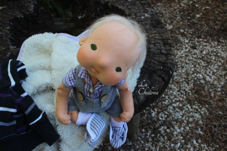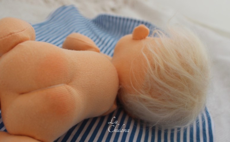 Julian is a 12 inch natural fibers baby doll slowly made with care and love. His skin is DWE in salmon color. He’s stuffed with clean carded wool. He’s slightly weighted with crystal beads inside a cloth bag in his torso. His head is very floppy and needs to be supported at all times, just like a real baby. His legs are jointed with plastic safety joints for better posing. His face is firmly needle felted, soft sculpted, and hand embroidered with cotton embroidery floss. Julian’s hair is a pale blonde mohair Kemper wig that is sewn to his head. It can be styled with fingers or carefully brushed with a baby brush. Julian is fully soft sculpted and anatomically correct.