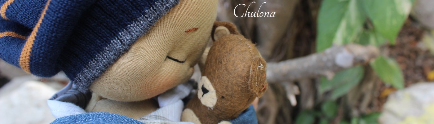 If you would like to adopt Hugo and help the world be a better place you should know that he is a 13 inch toy doll suited for a child 3 years and older. He was slowly handmade with organic cotton interlock hand dyed to a tan color. His head has two layers of fabric and is soft sculpted. He has a cute belly button and tushy also. His sleeping eyes and brown hair are hand embroidered with cotton thread. Hugo is not a natural fibers doll though, he is filled with polyester stuffing to allow for this kind of sculpting. He is pretty sturdy, his arms are sewn inside the seam of his body and his legs and torso are one piece. His head is attached to his body with strong nylon thread that is then hidden with stitches around the neck for a much smoother look. He’s made with lots of care and paying attention to details. He’s floppy, just like a real baby. Hugo has a cute little birth mark on his left leg that adds to his character.