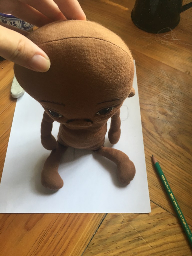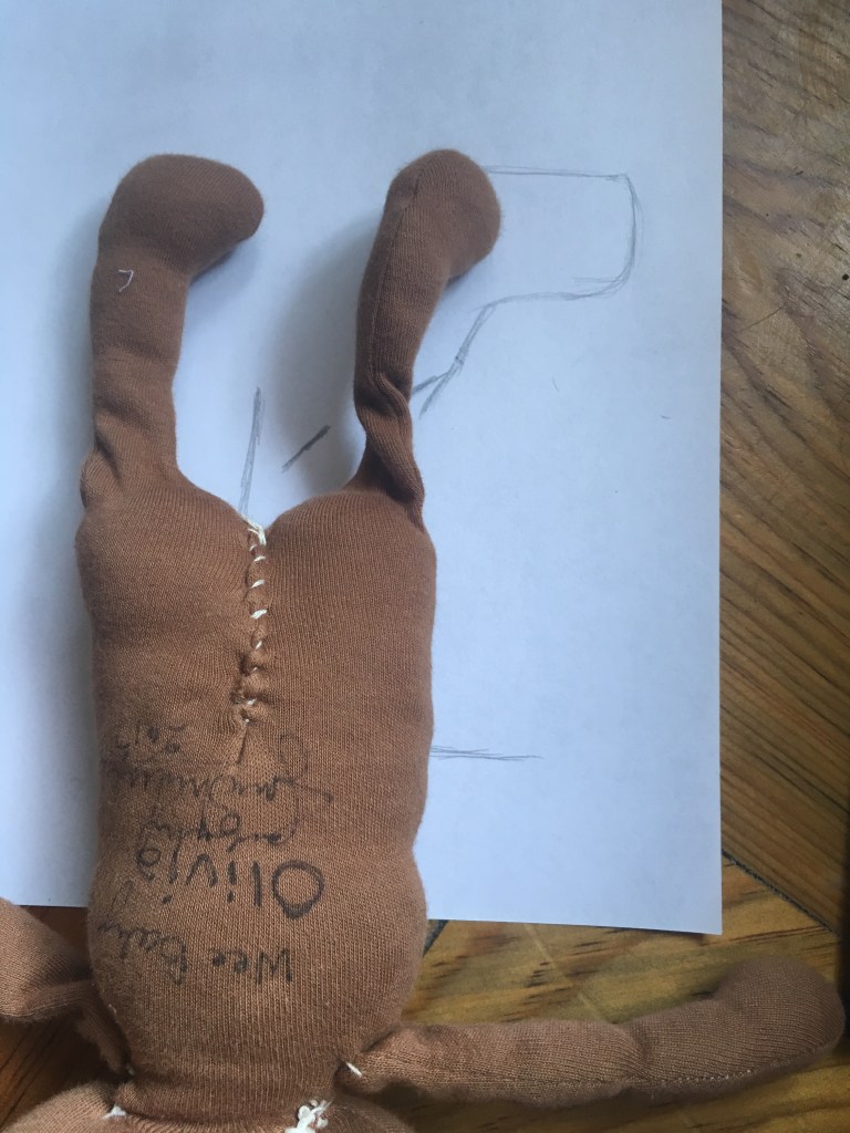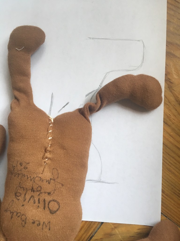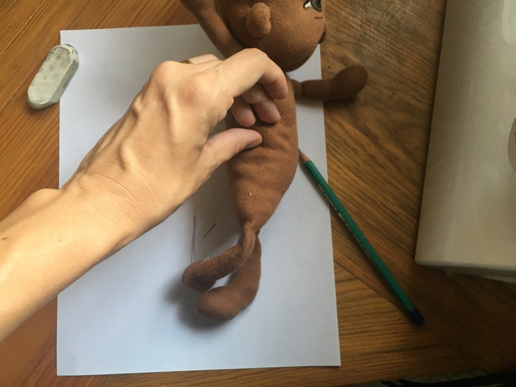 I also turn the doll to the side to mark where I would like the back flap to be when closed. This is usually a little off the middle of the doll’s belly.
