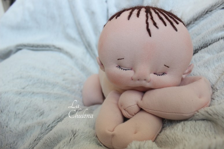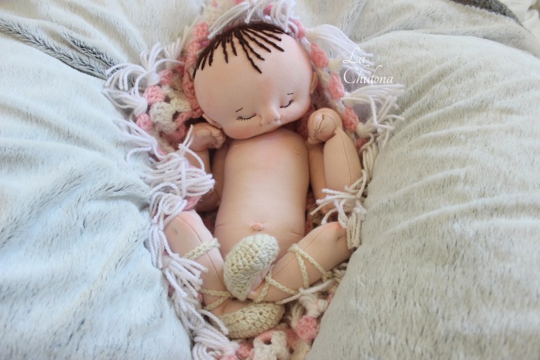 Now Louisa is NOT a natural fibers art doll. She is not filled with wool and is not a Waldorf inspired doll. She is a 22 inch newborn size soft sculpted Ooak baby doll with sleeping eyes and dark brown hair. Her body is made out of organic cotton interlock fabric hand dyed to a blushed color. The whole doll is made with 2 layers of fabric. She is fully soft sculpted and anatomically correct. Louisa has hand embroidered sleeping eyes and eyebrows. Her brown wool yarn hair has also been hand embroidered. Her blushing was made with a red orange bees wax crayon and is not permanent. Her arms are hand sewn to her body (they are floppy) and the legs are part machine sewn to the body and finished by hand for extra strength. Her head is attached with super strong nylon thread and then secured with a ladder stitch all around to make it more neat and aesthetically pleasing. The head is very floppy. You need to hold her head when you carry her, just like a real baby. This baby doll is stuffed with soft polyester stuffing. She is weighted with glass beads inside her head, torso, arms, and legs. Louisa weights a little over 3 lbs. She fits into most newborn clothes and some 3 month clothes.
