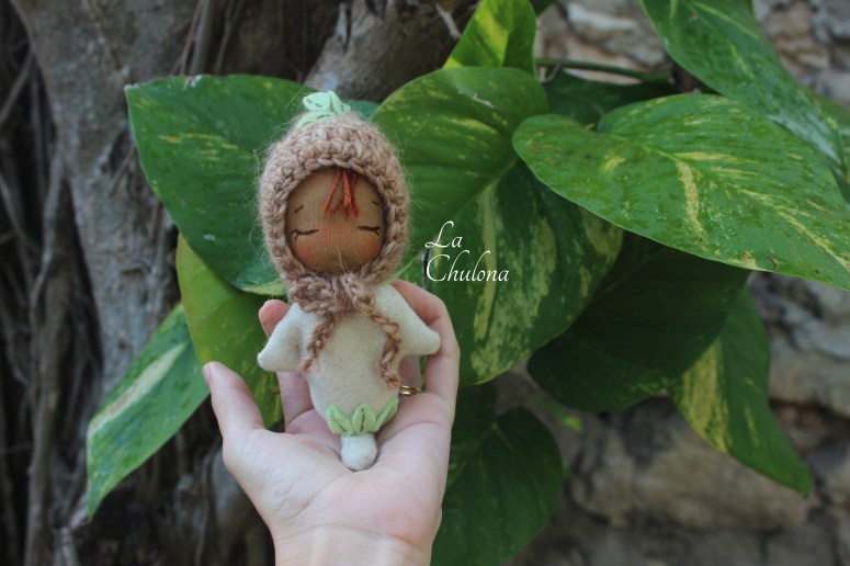 Now I also have a new doll to show you. My last Fall Dew Drop baby doll. Her name is Gaia. Gaia is a sweet 4.5 inches natural fibers baby doll. She’s filled with clean carded wool. Her head is made in the traditional Waldorf style, her cotton black eyes are embroidered and her blonde mohair hair is securely sewn to her head. Her body is a thick cotton fabric, the wool blend leaves have been hand sewn into her body and hat. Her hat is hand crocheted with cotton yarn. Gaia has a crocheted tiny dragonfly as a traveling friend. She comes inside her wool blend yellow leaf bed.