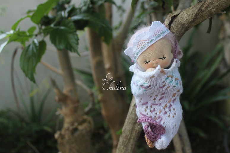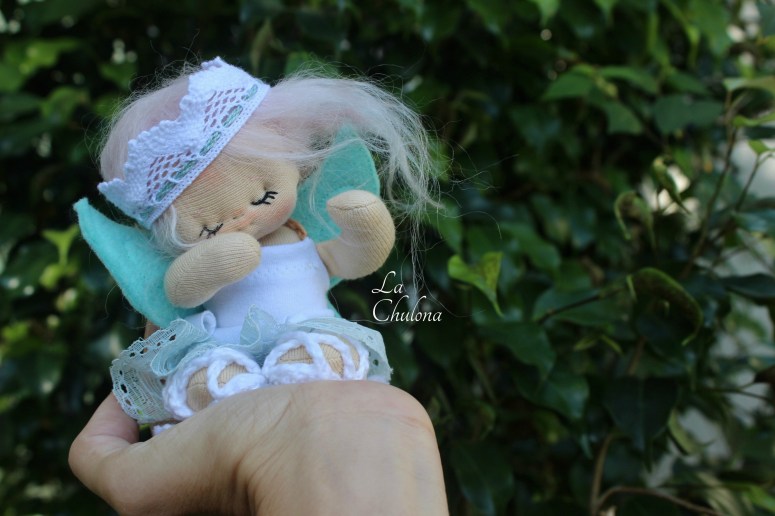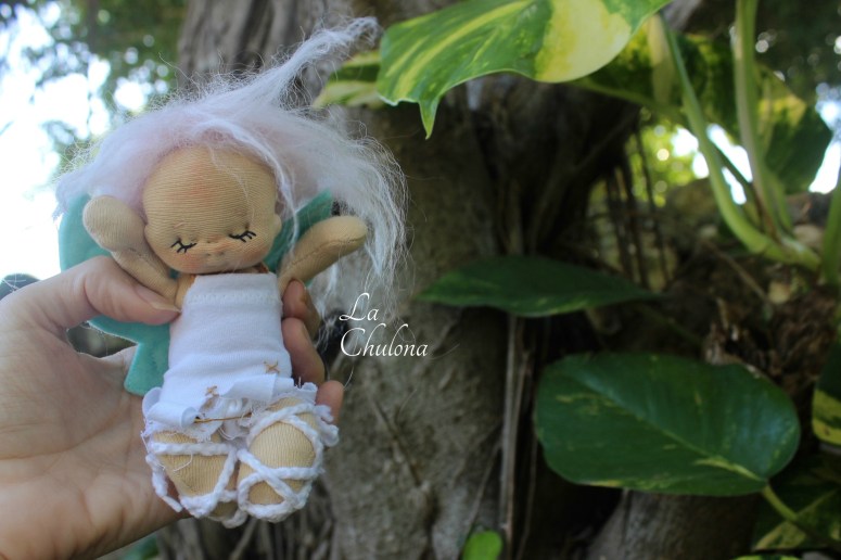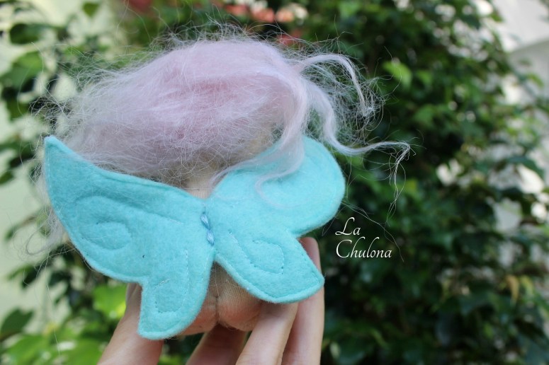 Eira is 5 inch winter fairy baby. She is NOT a waldorf doll. She is Not filled with wool. Eira is made with organic cotton interlock hand dyed to a light tan. She’s filled with soft polyester stuffing. Her face, belly button, and buttocks have been soft sculpted with upholstery thread. Her body and legs are one piece. Her arms  have been sewn into the seam of the body with a sewing machine. Her head has been attached with upholstery thread and then a couple of rounds of ladder stitches around the neck hide the threads to make it more neat. Her pink wild hair is a crocheted brushable mohair cap that has been securely sewn into her head. Her non-detachable wings are made with blue wool blend felt.