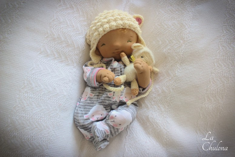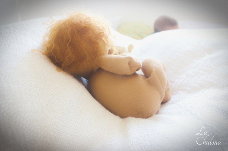 Elowyn’s skin is DWE in light brown, her limbs are filled with clean wool. Her torso is filled mostly with glass beads inside a big cloth bag. Her head is very floppy and needs to be supported at all times, just like a real newborn baby. Her legs and arms are floppy and very poseable. Her face is firmly needle felted, soft sculpted, and hand embroidered with cotton embroidery floss. Elowyn’s hair is a strawberry blonde curly mohair wig that has been sewn to her head. It can be gently styled with wet fingers. She’s fully soft sculpted and anatomically correct. Elowyn weights 1.25 Kilos (2.75 pounds).