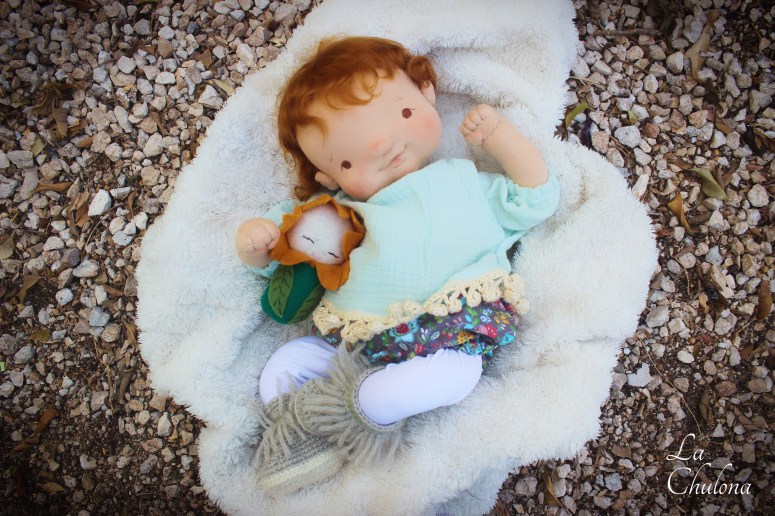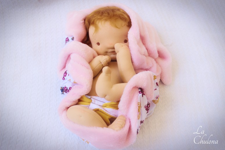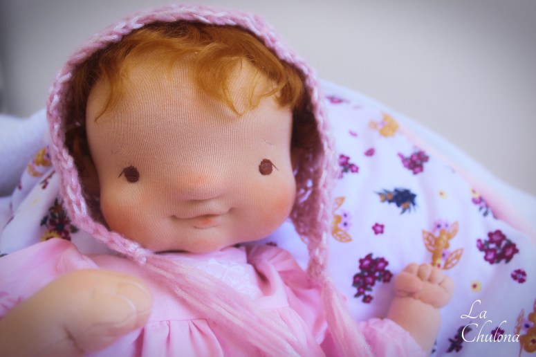 Malin’s skin is DWE , her limbs are filled with clean wool. Her torso is filled mostly with glass beads inside a big cloth bag. Her head is very floppy and needs to be supported at all times, just like a real newborn baby. Her legs and arms are floppy and very pose able. Her face is firmly needle felted, soft sculpted, and hand embroidered with cotton embroidery floss. Malin’s hair is a red wavy mohair wig that has been sewn to her head. It can be gently styled with wet fingers and soft brush. She’s fully soft sculpted and anatomically correct. Malin weights 1.400 Kilos (3 pounds).