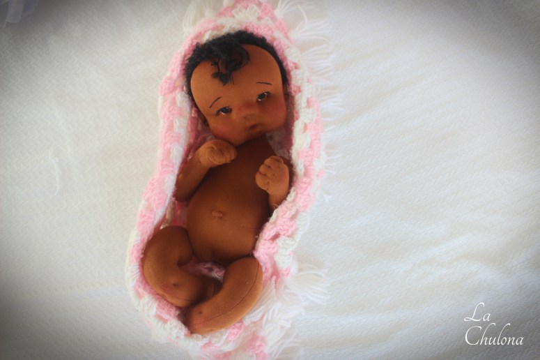 Belén is a 19 inch small newborn size natural fibers baby doll. She fits into newborn or bigger preemie clothes. Her skin is Laib Yala swiss tricot in red brown color, her limbs and torso are firmly filled with clean wool. Her head is very floppy and needs to be supported at all times, just like a real newborn baby. Her legs are sewn directly to the torso with upholstery thread. They are very floppy as well as her arms. Her arms are sewn to her torso with both upholstery thread and polyester thread. Her face is firmly needle felted, soft sculpted, and hand embroidered with cotton embroidery floss. Belén’s hair is a black crocheted wig cap made from big loopy mohair yarn. She also has a couple of strands tied to the cap in the front. She’s fully soft sculpted, very slightly weighted in the torso (she only weighs a little under 2 pounds), and she’s anatomically correct.