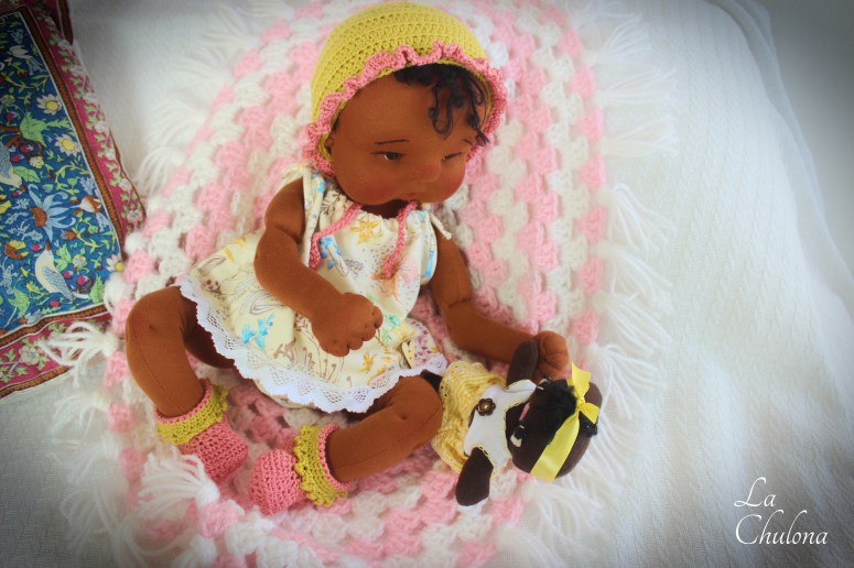 Hello again! You are probably wondering how in the world I was able to finish this sweet girl two weeks after I finished Fátima. Well, I’ll let you know my secret. I have a very helpful husband who is unemployed at the moment. He happily agreed to take care of the kids all day while I work full time. So instead of having my usual 4 hours of work a day, I now have 8 or more hours to let my creativity take over and make the dolls I dream of. I do have to take some breast feeding breaks here and there, so I’m really happy I get to work at home. I must say I had a lot of fun with this baby. I got to play with her and try some of V’s newborn clothes on her too. I even thought about keeping her just because she’s a doll I would definitely buy for myself.