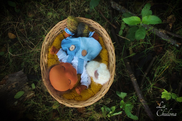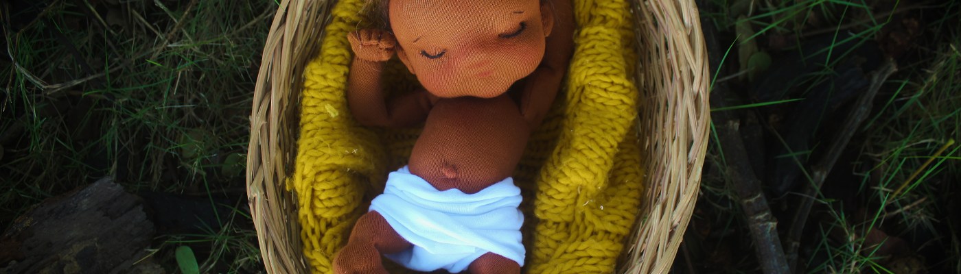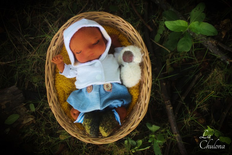 Baby Jesús is a 10 inch natural fibers baby boy doll. His skin is Laib Yala red brown color, his limbs and torso are firmly filled with clean wool and glass beads. His head is very floppy and needs to be supported at all times, just like a real newborn baby. His legs are torso are one piece. Arms are sewn directly to the torso with upholstery and polyester thread. They are very floppy. His face is firmly needle felted, soft sculpted, and hand embroidered with cotton embroidery floss. Jesús’ hair is a dark wild brushable mohair wig cap. It can be gently brushed. He’s fully soft sculpted, weighted in the torso, arms, and legs, and he’s anatomically correct.