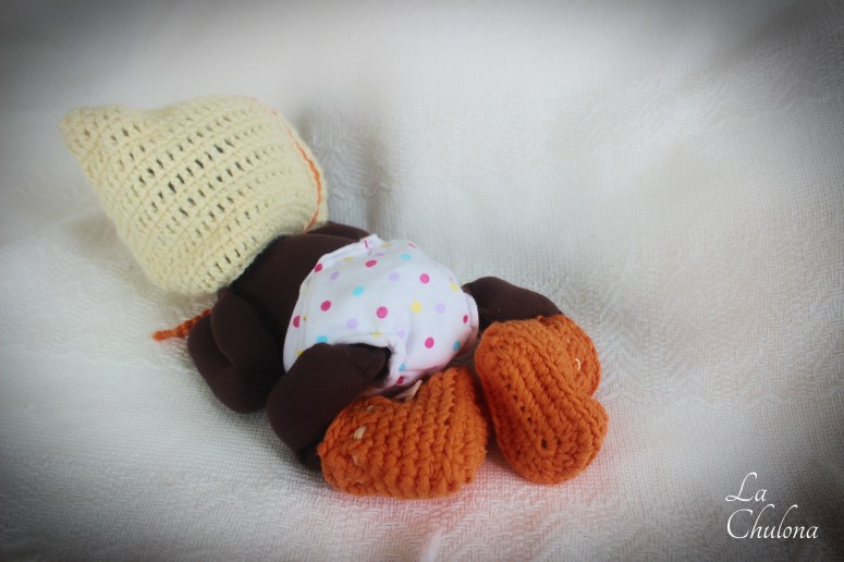 Paloma’s skin in DWE in dark brown, her brown eyes have been hand embroidered and her hair is a hand crocheted big loop mohair wig cap with some extra strands attached to it. Paloma turned out to be a little skinnier than Paula. Still she’s cute as a button. Paloma weights 850 grams or 1.87 pounds