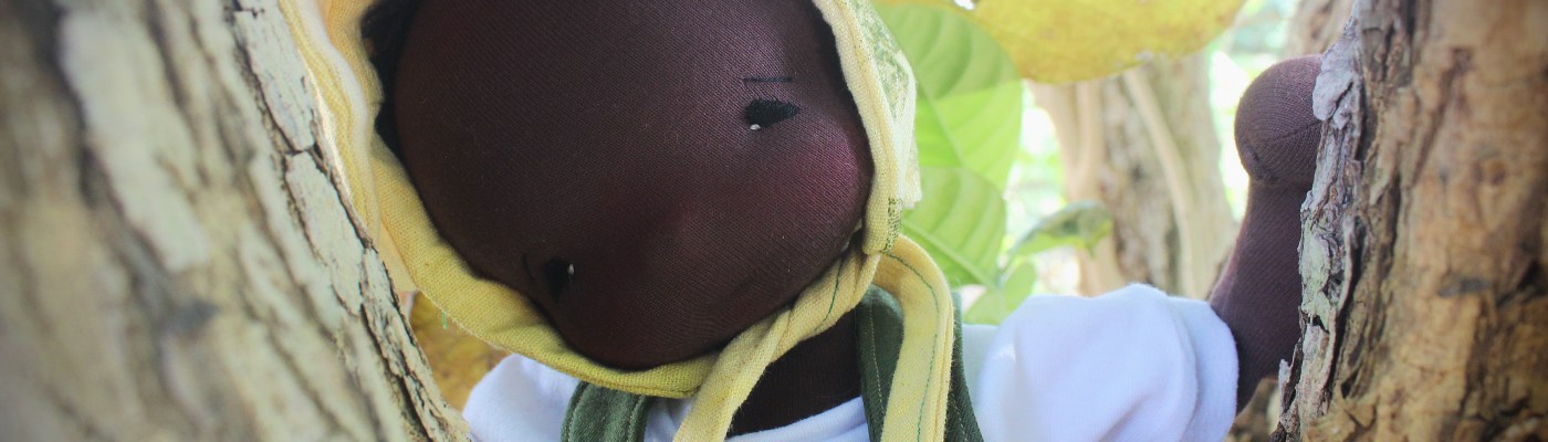 Josué is about 12 inches long. He’s a natural fibers art doll, filled very firm with clean wool and glass beads. He’s 625 grams of pure love and giggles. His head has been made in the traditional Waldorf style with some needle felting to make it firmer. He has a floppy head, legs, and arms. Legs bend at the knees too, and arms bend at the elbows. He’s really easy and fun to pose. His skin is DWE in dark brown. His hair is a crocheted camel, mohair, and polyamide yarn wig cap in a black color that has been sewn to his head. His hair does shed and that is one of the reasons he is not recommended for kids. His eyes have been hand embroidered with cotton black and white DMC thread. His clothes are made with cotton fabrics, and wool blend fabric and yarn.