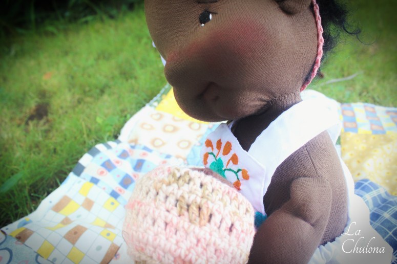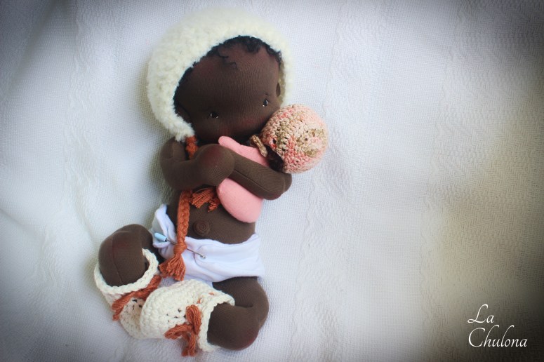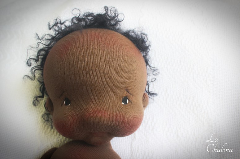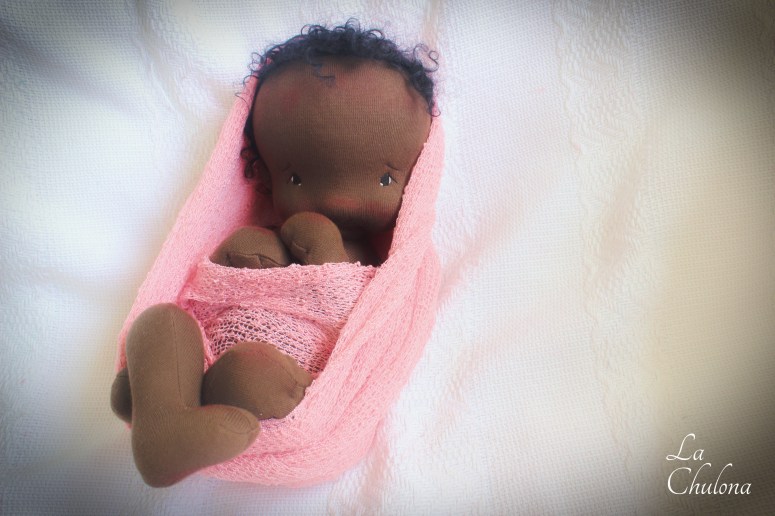 Sienna is a 16 inch natural fibers art baby doll. Her skin is Heavy Weight Laib Yala in dark brown color, her limbs are firmly filled with clean wool and glass beads. Her torso is weighted with glass beads too. Her head is floppy, just like a real newborn baby and needs to be supported at all times. Her arms and legs have been hand sewn to her torso three times to make it extra strong. They are very floppy as well and bend at the elbow, thighs, and knees. Her head is firmly needle felted. Her face is soft sculpted in the mouth and her eyes have been hand embroidered with cotton DMC thread. Sienna’s hair is a black curly mohair reborn wig that has been hand sewn to her head.