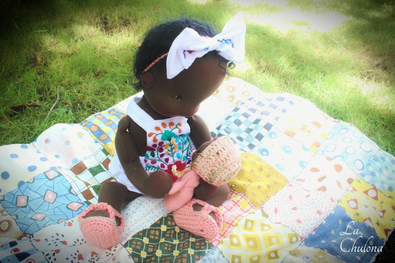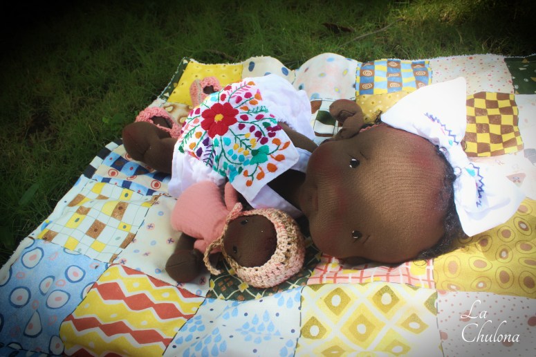 My new baby girl is finally ready. I am truly in love with her and I was contemplating keeping her. I think that might have been the reason I kept pushing back the making of her clothes. However, I feel that taking my time to think and rethink these clothes paid off. I love her two outfits very much. I hope you love them too. One was inspired in Mexico, and actually made from a child’s Mexican dress and the other ended up being improvised because half way through cutting the fabric, I realized I didn’t have enough for the pattern. haha! I had to change the design a little and I like it way more my way.