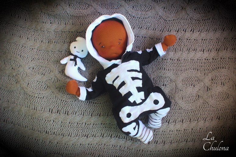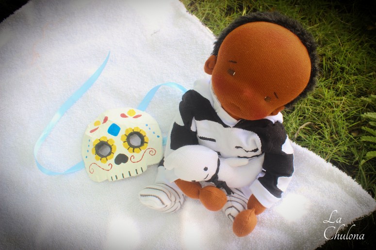 Little Julio loves skulls and skeletons and he asked for a special outfit for this special day. I decided to make it as comfortable as possible so he could be in a stroller and maybe fall asleep there. You see the skeleton costume serves as pajamas as well. Isn’t that convenient? He loves it but he told me he is going to be walking before that day because he wants to go trick or treating with the rest of the kids in the neighborhood. What??? Well, he has been pulling himself up and cruising everywhere. This boy is definitely on a mission. So I made him some shoes to practice and I’m so happy he already has a mask in case he gets to trick or treat with other kids. You can never be too careful these days.