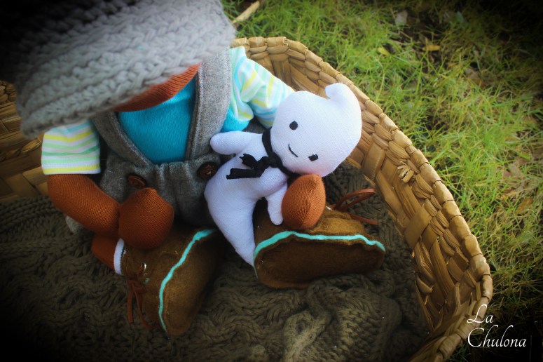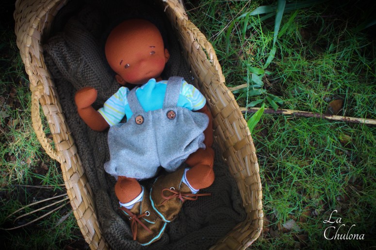 Julio is a 12 inch natural fibers baby doll. His skin is heavy weight Laib Yala in red brown color, he’s firmly stuffed with clean wool. His head is floppy. His legs and torso are one piece but the legs are floppy because of the way they have been sewn. They can also bend at the knees. His arms have been sewn to his torso three times to make it extra strong. They are very floppy as well and bend at the elbow and wrist. His head is made in the traditional Waldorf style with some needle felting to make it firmer. His brown eyes have been hand embroidered with DMC cotton embroidery floss. Julio’s hair is a black mohair mix crocheted wig cap. This yarn does shed a little so this doll is not recommended for babies. The crochet cap has been hand sewn to his head. He’s easy and fun to pose.