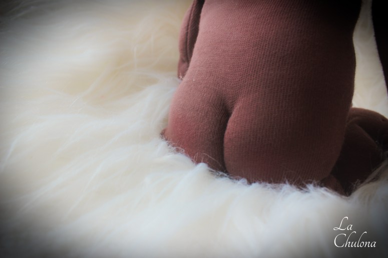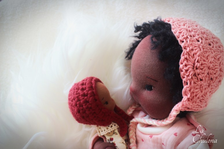 Lorena is a 15 inch natural fibers art baby doll. She’s fully soft sculpted and anatomically correct. Her skin is Waldorfia hago jersey in brown, her limbs are fully lined and firmly filled with clean wool and glass beads. Her torso is needle felted in two parts and weighted with glass beads. Her head is floppy but has some stability. You can prop her more easily to keep her head up. Her arms and legs have been hand sewn to her torso three times to make it extra strong. They are very floppy as well and bend at the elbow, thighs, ankles, and knees. Her head is firmly needle felted and soft sculpted in the mouth and nose. Lorena’s hair is a hand crocheted big loop black mohair cap with added strands that has been hand sewn to her head. This hair cannot be brushed. Her blushing has been made with chalk pastels.