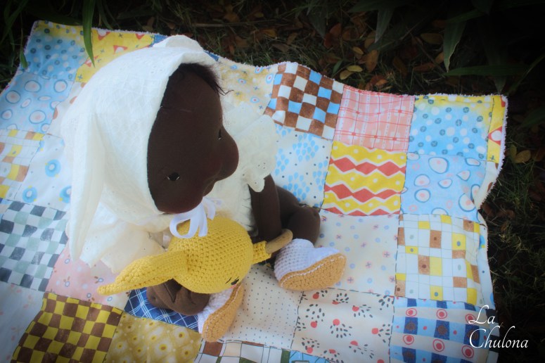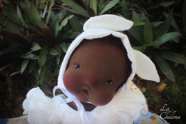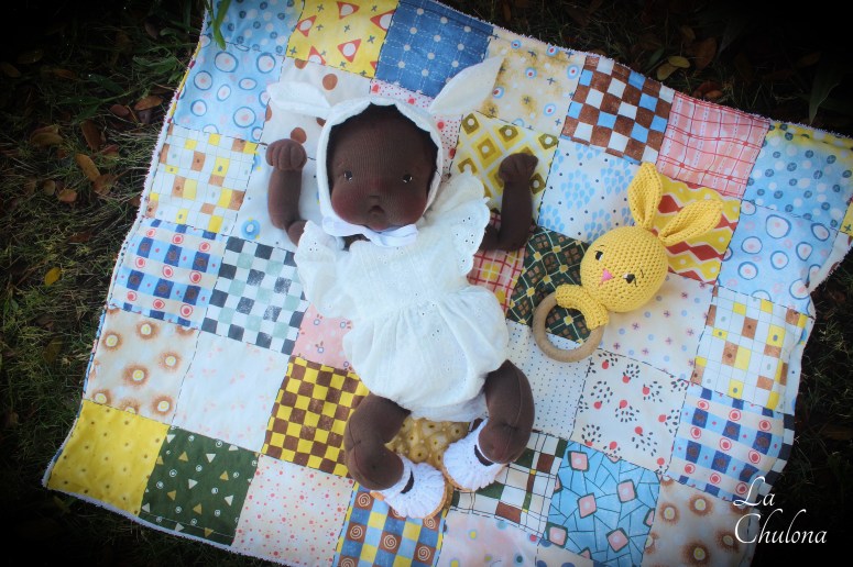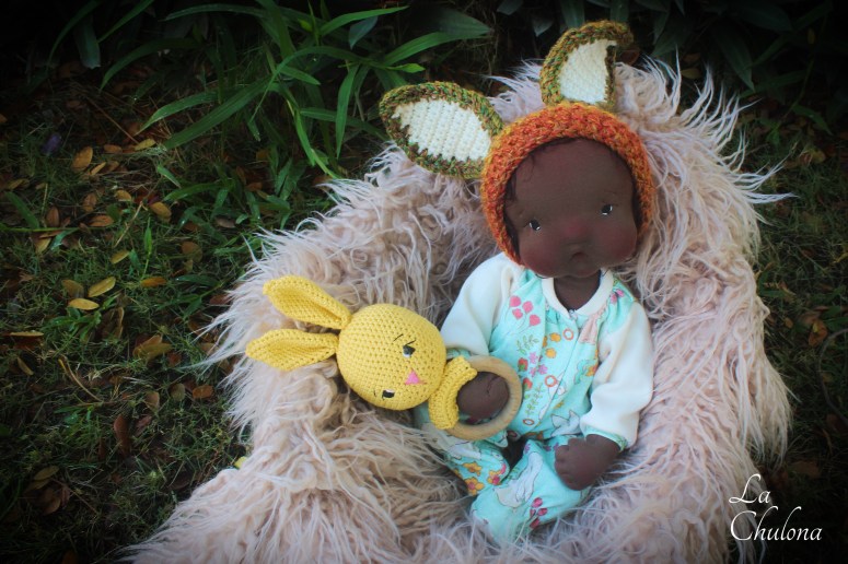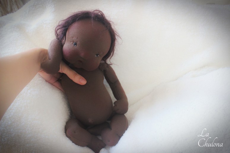 Aurora is a 17 inch natural fibers art baby doll. She’s fully soft sculpted and anatomically correct. Her skin is Heavy Weight Laib Yala in dark brown, my favorite fabric in my favorite color. Her limbs are fully lined and firmly filled with clean wool and glass beads. Her torso is needle felted in two parts and weighted with glass beads. Her head is very floppy and needs support when you hold her. Her arms and legs have been hand sewn to her torso three times to make it extra strong. They are very floppy as well and bend at the elbow, thighs, ankles, and knees. Her head is firmly needle felted and soft sculpted in the mouth and nose. Aurora’s hair is a hand crocheted wild brushable mohair wig. It was originally pink but I hand dyed it to this dark brown color. Her hair can be brushed though I haven’t brushed it because I feel it looks more baby- ish this way. Her blushing has been made with a red bees wax crayon and it is not permanent.
