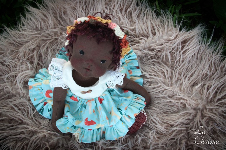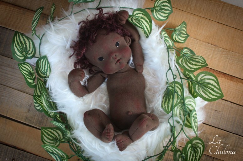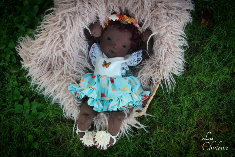 Marcela is a 17 inch natural fibers art baby doll. She’s fully soft sculpted and anatomically correct. Her skin is Heavy Weight Laib Yala in dark brown. Her limbs are fully lined and firmly filled with clean wool and glass beads. Her torso is needle felted in two parts and weighted with glass beads. Her head is floppy but still has some support. Her arms and legs have been hand sewn to her torso three times to make it extra strong. They are very floppy as well and bend at the elbows, shoulders, thighs, ankles, and knees. Her head is firmly needle felted and soft sculpted in the mouth and nose. Marcela’s hair is a handmade wig made from a hand dyed mohair weft that has been hand sewn to a hand crocheted wig cap and then hand sewn to the head. Her hair can be gently brushed and restyled. Her blushing has been made with a red beeswax crayon.