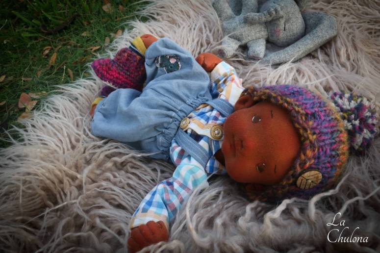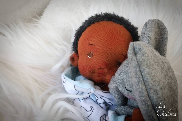 Kabir is a 12 inches natural fibers art baby doll. He’s fully soft sculpted and anatomically correct. His skin is Laib Yala in red brown, his limbs are fully lined and firmly filled with clean wool and glass beads. His torso is needle felted in two parts and weighted with glass beads. His head is a little floppy and can be moved around. His arms and legs have been hand sewn to his torso three times to make it extra strong. They are very floppy and bend at the elbows, knees, and thighs. His head is firmly needle felted and soft sculpted in the mouth and nose. Kabir’s hair is a hand crocheted black mohair mix cap, it has been hand sewn to his head. His blushing has been made with a beeswax crayon, some pastels, and color pencils.