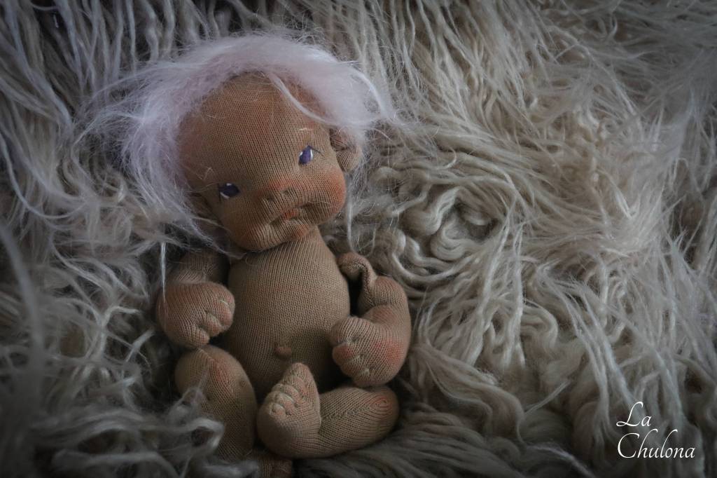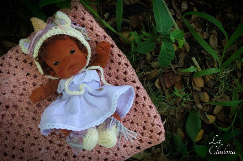 Candela is a 7 inch baby girl. Her skin is Laib Yala in red brown. Her black eyes have been hand embroidered with DMC thread, and her hair is a hand crocheted small loop mohair cap that has been hand sewn to her head. She has a firmly needle felted face with soft sculpted features. She’s fully soft sculpted and anatomically correct. Her blushing was made with a red beeswax crayon and is not permanent. She is a natural fibers doll, filled with clean wool. Her head arms and legs are floppy for better posing.
