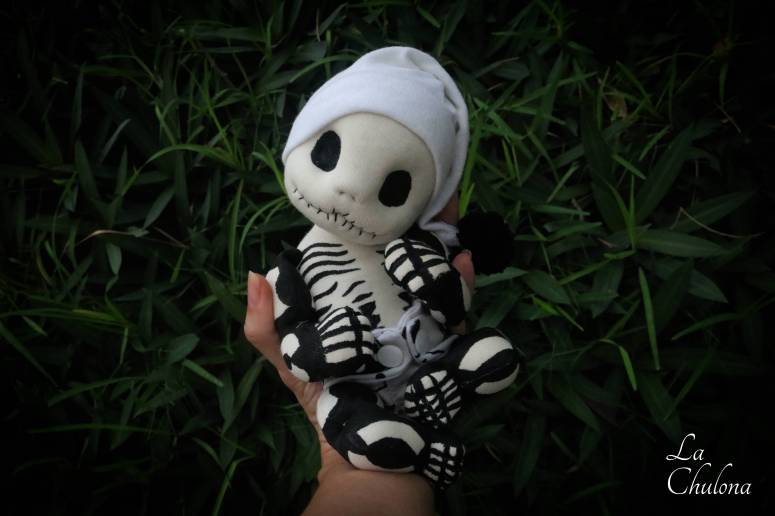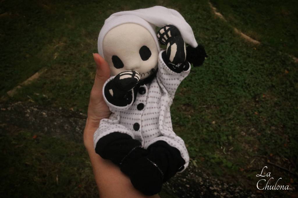 Jake is a 10inch natural fibers baby doll. His skin is Organic Cotton Interlock hand painted to look like a skeleton. His head is very floppy, after all he is a skeleton. His legs and arms are floppy on the shoulders and thighs. Arms are sewn directly to the torso three times for extra strength. Legs and torso are one piece. His head is firmly needle felted, soft sculpted, hand painted with fabric paint, and hand embroidered with cotton embroidery floss. His body has been hand painted with black fabric paint. Jake has many soft sculpted details that make him a very unique doll. This is a handmade doll and even though it was made with love and care, it may have some happy accidents on it that make him even more unique. Nothing major or very noticeable of course.