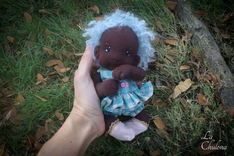 Afina is a 7 inch spring baby. Her skin is DWE in dark brown color. Her dark blue eyes have been hand embroidered with DMC thread, and her light blue curls are a big loop mohair wig cap with some loop stitches. The wig cap has been hand sewn to her head. She has a firmly needle felted face with soft sculpted features. She’s fully soft sculpted and anatomically correct. Her blushing was made with a red beeswax crayon and is not permanent. She is a natural fibers doll, filled with clean wool. Her head, arms, and legs are floppy for better posing.