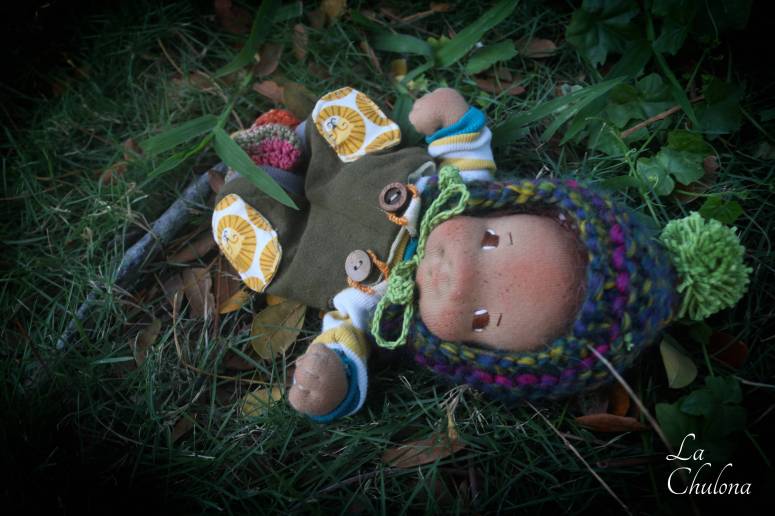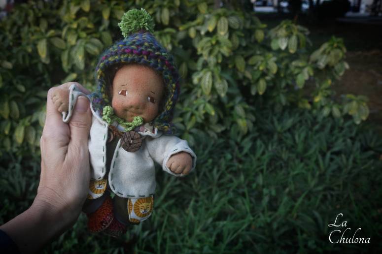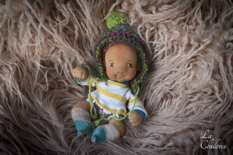 Leo is a 7 inch mini baby boy. His skin is DWE in light brown color. His eyes have been hand embroidered with DMC thread, and his two toned hair is a wild brushable mohair crocheted wig cap. The wig cap has been hand sewn to his head. This style of hair can be brushed gently to refresh. He has a firmly needle felted face with soft sculpted features. He’s fully soft sculpted and anatomically correct. His blushing was made with an orange/red beeswax crayon and is not permanent but you can easily retouch it. He is a natural fibers doll, filled with clean wool. His head, arms, and legs are floppy for better posing.