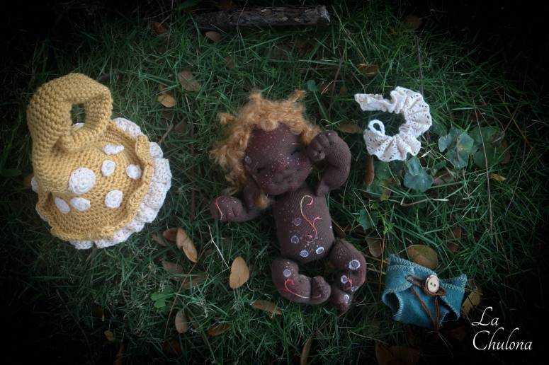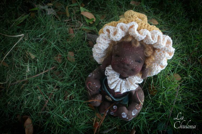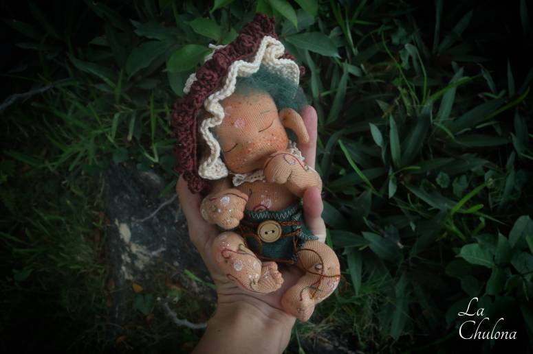 Baby Salvia is an almost 8 inch natural fibers baby doll. Skin is Heavy weight Laib Yala in dark brown color. Spots and freckles have been painted with fabric paint in white, brown, and gold. Limbs and torso are firmly filled with clean wool. Head is not floppy but wobbly. Legs and arms are floppy on the shoulders and thighs. Arms are sewn directly to the torso three times for extra strength. Legs and torso are one piece. The head is firmly needle felted, soft sculpted, and hand embroidered with DMC cotton embroidery floss. Salvia’ hair is a big loop mohair wig cap in caramel color. It has been hand sewn to the head. This hair cannot be brushed. The embroidery on the body has also been made with DMC cotton floss. Gnome ears are hand sewn to the head. The doll is fully soft sculpted but not anatomically correct because it is meant to be a gender neutral doll. Blushing was made with an red beeswax crayon and it is not permanent. You will get a little piece of cloth with some blush so you can retouch it if necessary.