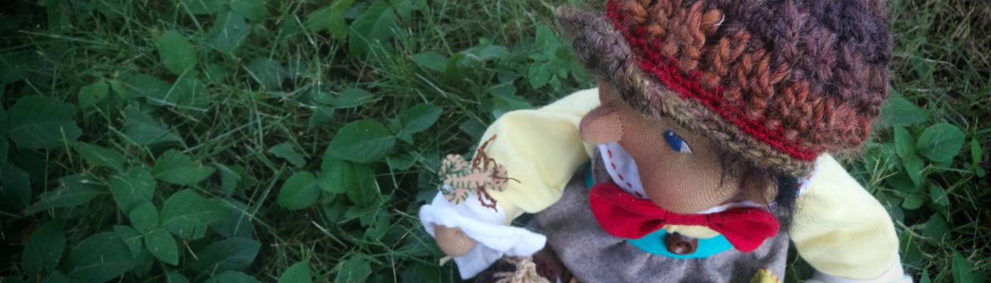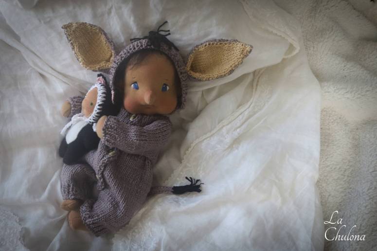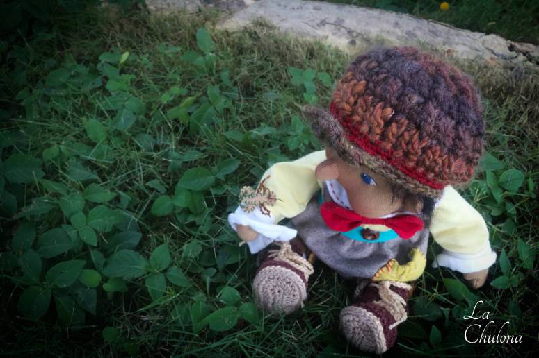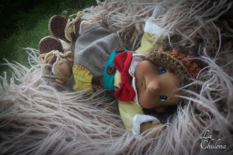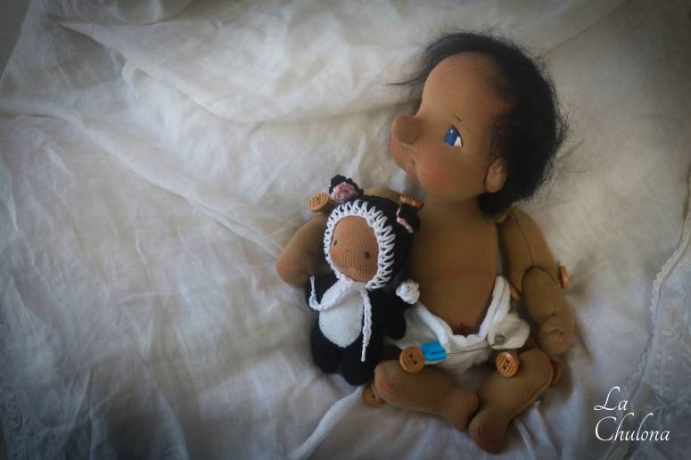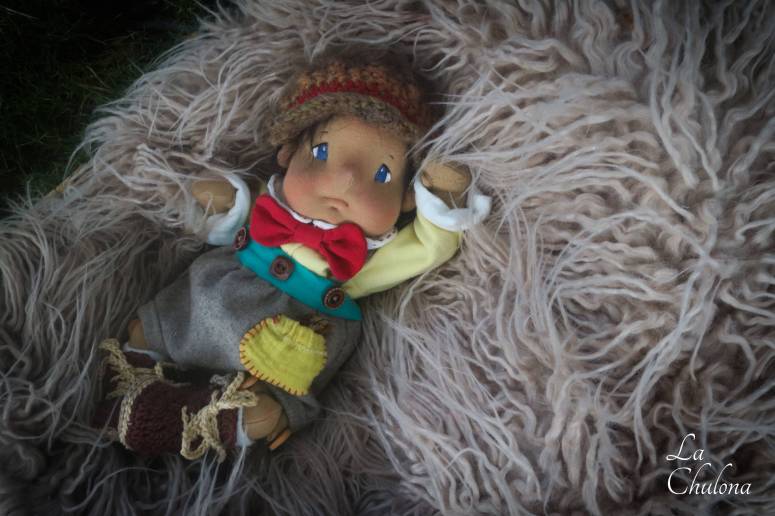 Pinocchio is an almost 12 inch natural fibers art baby doll. His skin is DWE in light brown. His torso is slightly weighted with glass beads and needle felted, then covered with the skin fabric. His arms and legs are fully lined and hinged jointed with wooden beads at the knees, elbows, and hips. This is a complete new technique for me and I really enjoyed it though it took me much longer to make. He is not fully soft sculpted because he is meant to look like a wooden toy, but he has many cute details to make him look like a wooden puppet. Pinocchio’s head is wobbly and is made with a technique learned with Fabiola from Fig and me. He is a fully articulated doll that can be easily posed. His blushing has been made with colored pencils, chalk pastels, and a red orange bees wax crayon. It is not permanent and it can be refreshed with a crayon, chalk pastels, or make up.