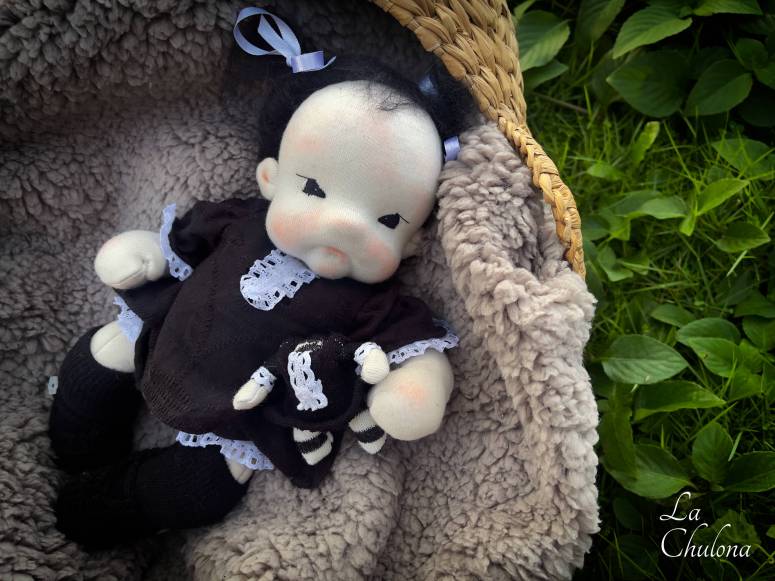 Miércoles is a 10 inch natural fibers art baby doll. She’s not fully soft sculpted but she has a cute belly button and bum. She is also anatomically correct. Her skin is organic cotton interlock in it’s natural color. Her whole body is fully lined and mostly stuffed with glass beads. She only has wool on his toes, hands, belly and buttocks. That is why she is so floppy. Her head is floppy. Her arms have been hand sewn to her torso three times to make it extra strong. They are floppy as well. Her head is firmly needle felted and soft sculpted in the mouth and eyes. Her eyes have been hand embroidered with DMC thread. Miércoles is the first cuddle baby with hair and her hair is a hand crocheted wild brushable mohair wig that has been hand sewn to her head. Her blushing has been made with colored pencils, makeup, and an orange red bees wax crayon. It is not permanent and it can be refreshed with a crayon.