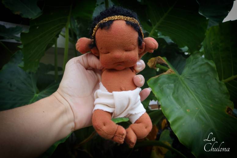 Jesús is a 7 inch natural fibers baby doll. His skin is DWE in red brown color. His hair is a black hand crocheted small loop mohair yarn wig cap that is hand sewn to his head. His limbs and torso are filled with clean wool. His head is floppy. His legs and arms are floppy on the shoulders and thighs. Arms are sewn directly to the torso three times for extra strength. Legs and torso are one piece. His head is firmly needle felted and soft sculpted. His blushing was made with a red beeswax crayon and it is not permanent. You will get a little piece of cloth with some blush so you can retouch it if necessary. Jesús is fully soft sculpted but not anatomically correct.