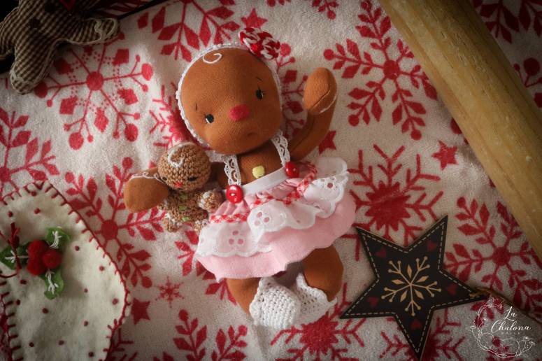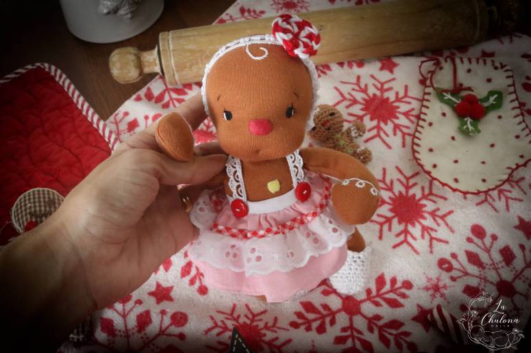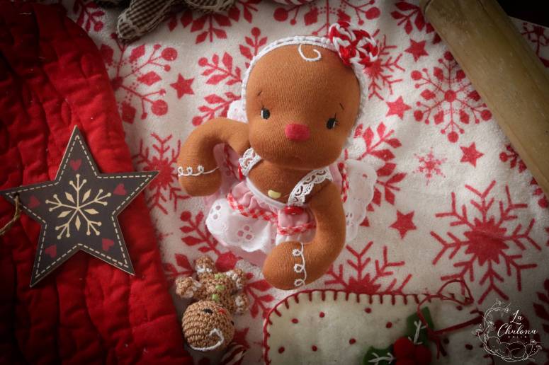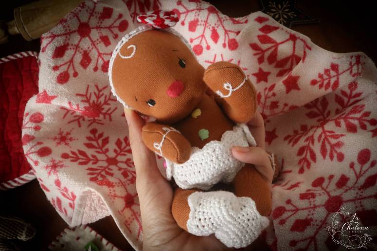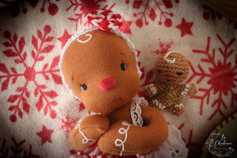 Are you ready for a very sweet doll? Meet Canela. My new Christmas baby and probably the sweetest. This is the first time I make an actual gingerbread baby doll in wool, and glass beads I guess. I had made soft sculpted and regular rag doll gingerbread babies before but never out of wool. Even though I always had the vision in my head, I was also a little scared of messing her up. I guess wasn’t sure of my skills then, so I waited until I felt more confident about how cute she was going to be. I must say I am happy I waited because I love how she turned out. I think she has such an innocent expression that matches her sweetness almost perfectly. Well, I might be a little biased here. haha!