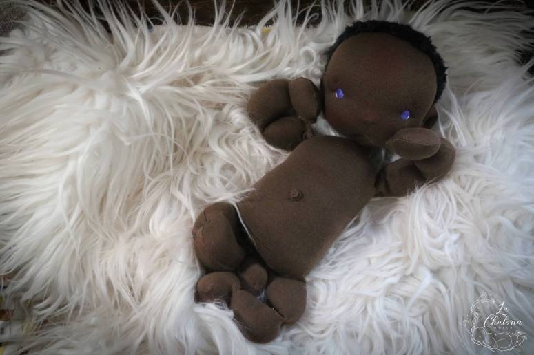 Jadu is an 14 inch Waldorf baby boy doll. His skin is Heavy Weight Laib Yala in dark brown. His blue eyes have been hand embroidered and his hair is a hand crocheted with a black wool mix fluffy yarn. His blushing was made with an orange red beeswax crayon and is not permanent. He is a natural fibers doll, filled with clean wool. His head has been made in the traditional Waldorf style. He is articulated on his shoulders, elbows, wrists, hips, knees, and ankles for better posing. His head is wobbly like a real baby. This baby doll is pretty floppy and very fun to pose. This baby is not weighted.