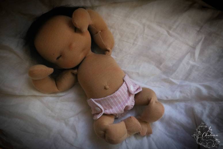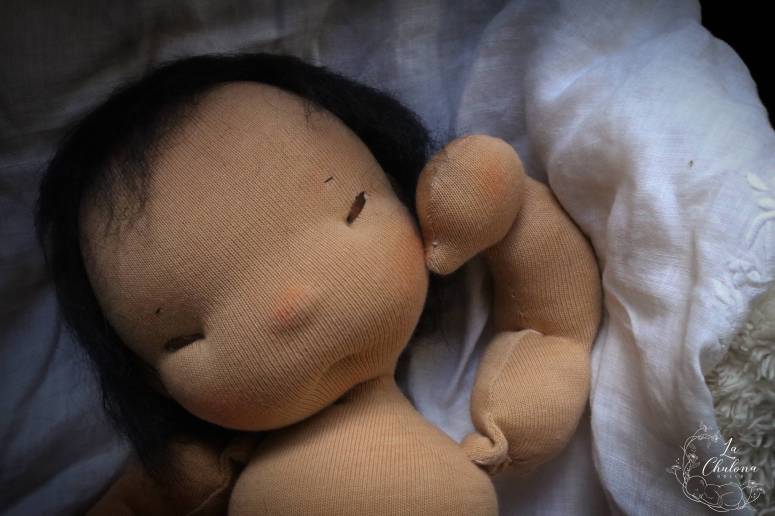 Zhi Xin is a 14 inch Waldorf baby girl doll. Her skin is Heavy Weight Laib Yala in a peach color. Her brown slanted eyes have been hand embroidered with DMC threads. Her hair is a hand crocheted black wild brushable mohair wig cap that has been hand sewn to her head. It can be gently brushed and styled. Her blushing was made with an orange red beeswax crayon and is not permanent. She is a natural fibers doll, filled with clean wool. Her head has been made in the traditional Waldorf style. She is articulated on her shoulders, elbows, wrists, hips, knees, and ankles for better posing. Her head is wobbly like a real baby. This baby doll is pretty floppy and very fun to pose. This baby is not weighted.