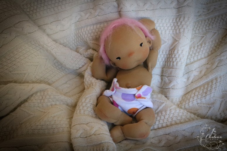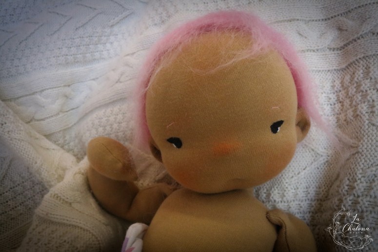 Sawako is a 13 inch Waldorf baby girl doll. Her skin is De Witte Engle in a light brown color. Her black eyes have been hand embroidered with DMC threads. Her hair is a hand crocheted hand dyed pink wild brushable mohair wig cap that has been hand sewn to her head. It can be gently brushed and styled. Her blushing was made with an orange/red beeswax crayon and is not permanent. She is a natural fibers doll, filled with clean wool. Her head has been made in the traditional Waldorf style. She is articulated on her shoulders, elbows, wrists, hips, knees, and ankles for better posing. Her head is wobbly like a real baby. This baby doll is pretty floppy and very fun to pose. This baby is not weighted.