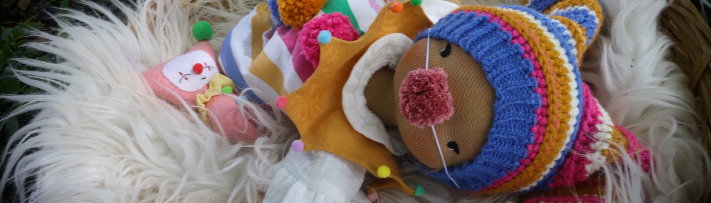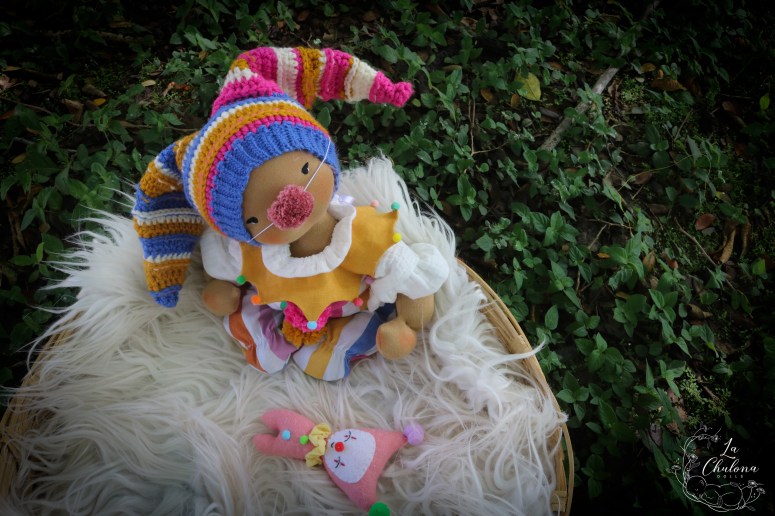 In an effort to find some joy Sawako was born. I must say I am not a big fan of clowns. I find them a little creepy, I’m not going to lie. I think movies have ruined them for me. haha! So as usual I try to turn what I consider scary into something that I find cute and beautiful. Sawako is the perfect example of a cute little jester clown. I was able to use left over yarns to make the hat and pompoms and her romper is made with an upcycled girls dress. I am so happy I was able to get matching colors without even needing to go the store. I love how not scary but quiet adorable she turned out in the end. I hope you think so too.