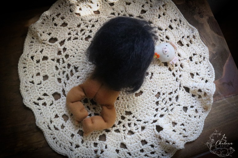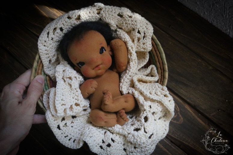 Xochitl is an 8 inch natural fibers baby doll. Skin is DWE in a light brown color. Limbs and torso are firmly filled with clean wool. Head is floppy. Legs and arms are floppy on the shoulders and thighs. Arms are sewn directly to the torso three times for extra strength. Legs and torso are one piece. The head is firmly needle felted, soft sculpted on the mouth and eyes, and hand embroidered with DMC cotton embroidery floss. She house long eyelashes also. This doll is fully soft sculpted. Her black hair is a hand crocheted wild brushable mohair wig cap that has been brushed to have some length. The wig has been hand sewn to her head. This hair can be gently brushed and styled. Ears are hand sewn to the head as well. Blushing was made with a red beeswax crayon and it is not permanent. You will get a little piece of cloth with some blush so you can retouch it if necessary.